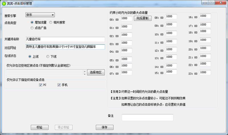 进入软件的网址管理模块,在新增或修改点击目标的界面上,搜索引擎选择京东,在“关键词名称”输入框,输入搜索关键词的名称,在“对应网址”输入框,粘贴前一步复制下来的标题或标题的一部分,“点击类型”选择“增加流量”,其他选项根据个人情况选择